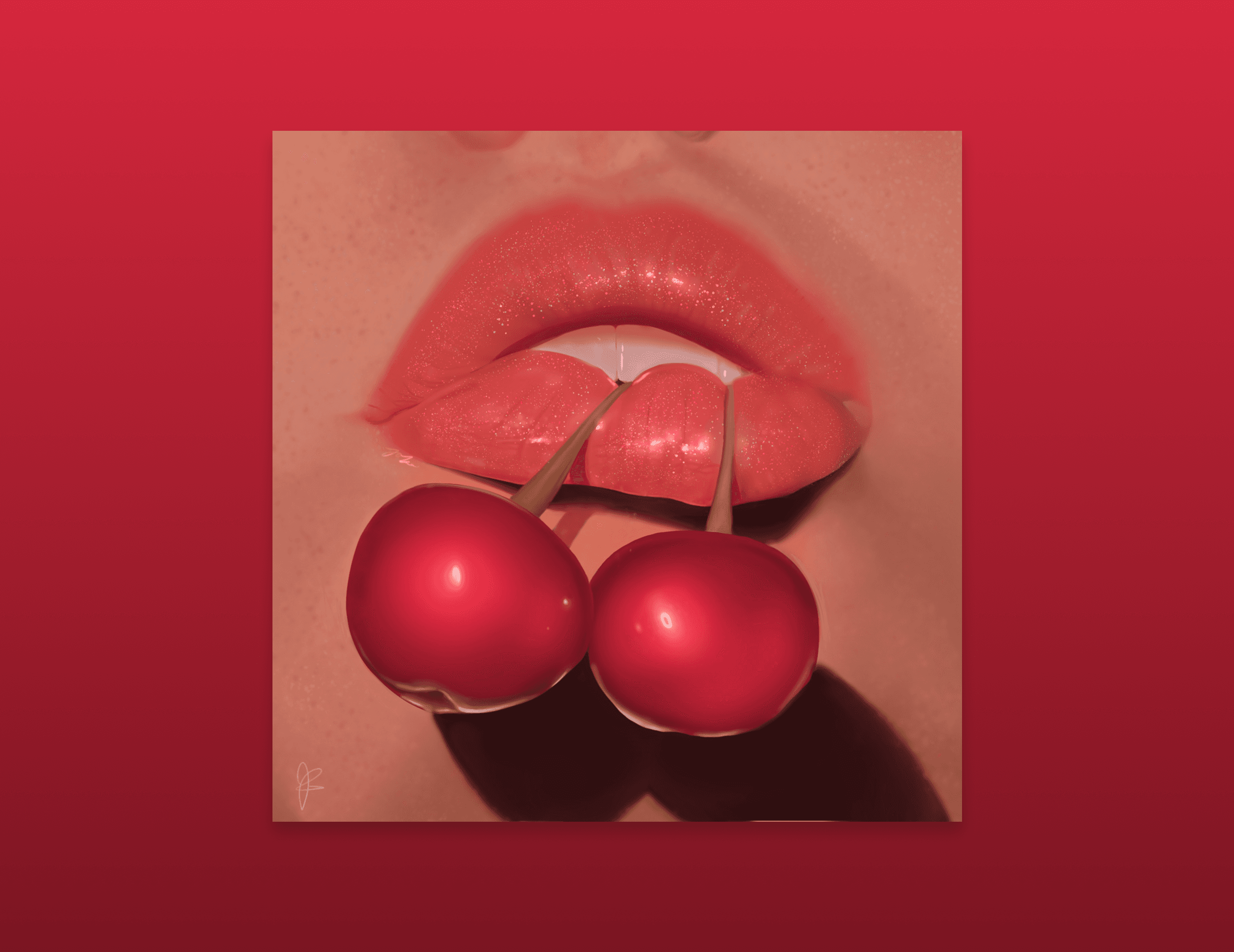 This piece aims to capture a subtle sense of sensuality and allure. In this artwork, I've focused on portraying the close-up of a woman's lips, painted with a rich crimson hue, gently holding a pair of ripe cherries. These cherries dangle delicately from her lips, symbolizing a tantalizing kiss and inviting viewers to explore the emotions hidden behind the image.