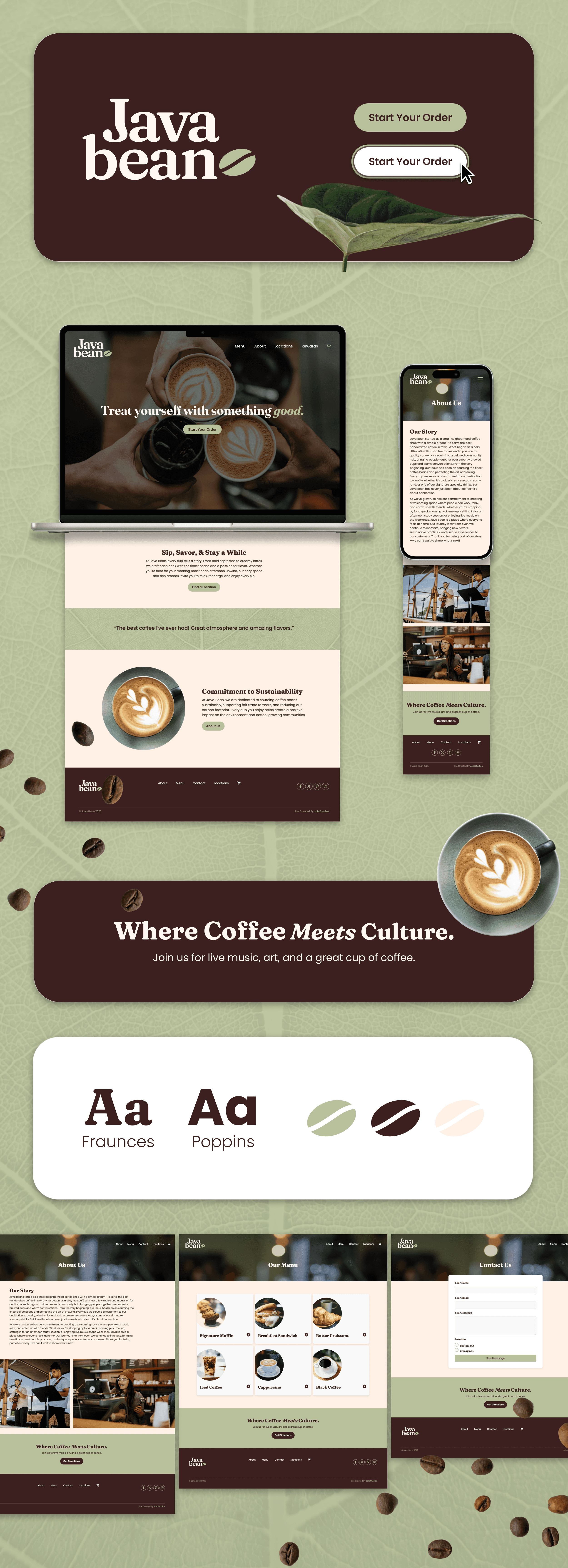 The Java Bean website was planned in Figma and built in HTML/CSS using VS Code, with a responsive layout, clean semantic code, and a warm, cozy aesthetic. Sketches and mood boards guided the style, and all assets were original and copyright free. Refinements focused on spacing, image quality, typography, and UX polish. The final site loads smoothly, works across devices, and reflects a simple, welcoming brand.