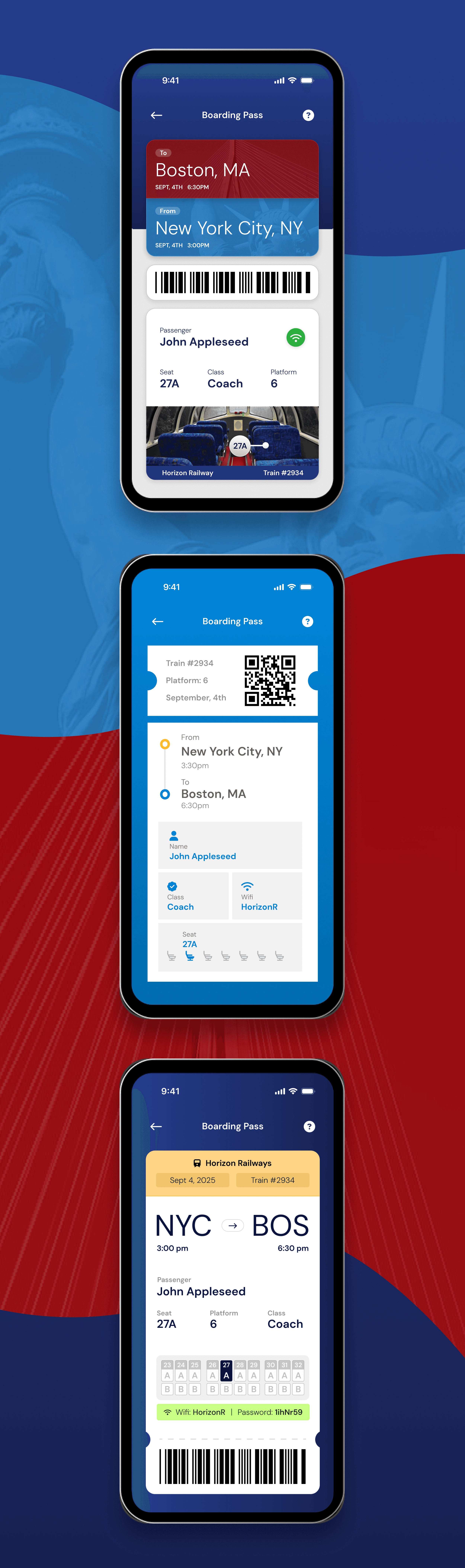I designed three mobile boarding pass layouts in Figma, focusing on clear hierarchy, bold iconography, and strong contrast to make Wi-Fi, seating, and departure details easy to scan. I explored multiple variations to balance clarity and information density, refining spacing and icon styles based on feedback. The final designs are consistent, accessible, and intuitive across screen sizes.