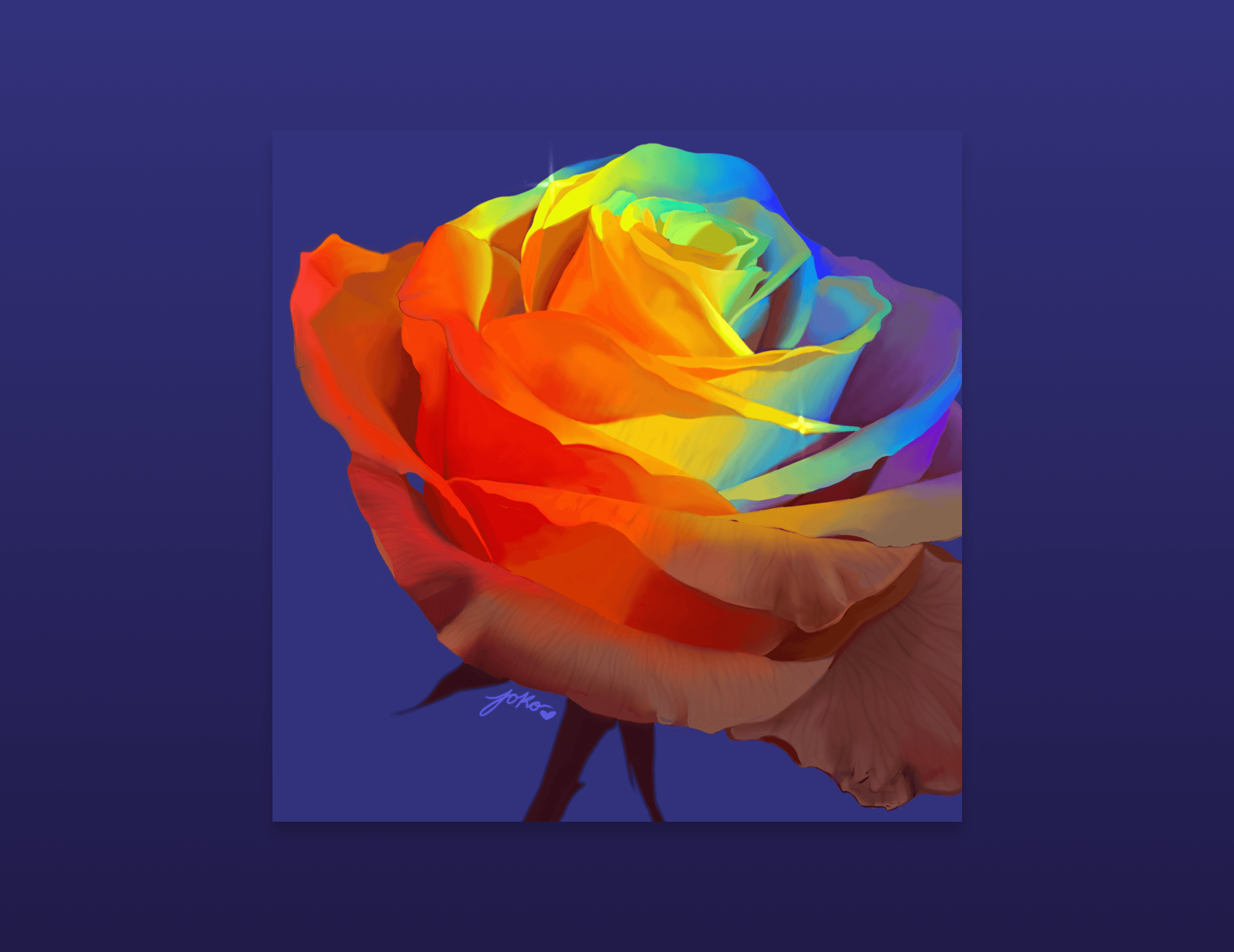 "Rainbow Rose" is a digital illustration that I've created as a part of a photo study. The artwork showcases a single rainbow-colored rose against a vivid and vibrant purple background. My intention with this piece was to explore the delicate beauty of a rose using a study of colors and forms.
